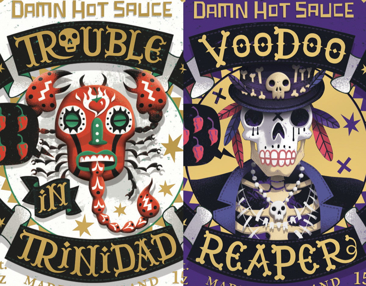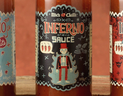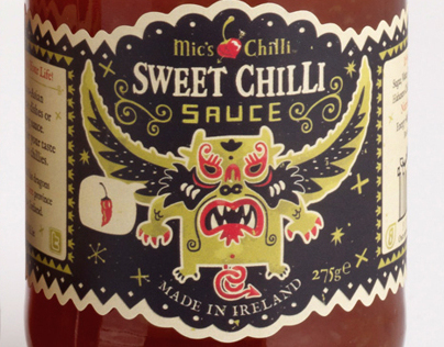 Chilli sauce labels designed and illustrated for Irish company, Mic's Chilli. These labels have successfully won awards at: The Society of Illustrators (NY), Association of Illustrators (UK), Applied Arts (Canada) and a bronze bell at the Institute of Creative Advertising & Design ICAD (Ireland).
