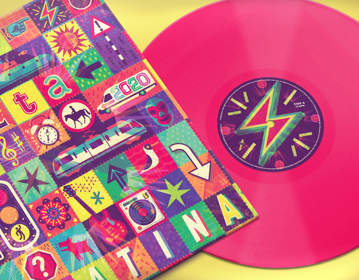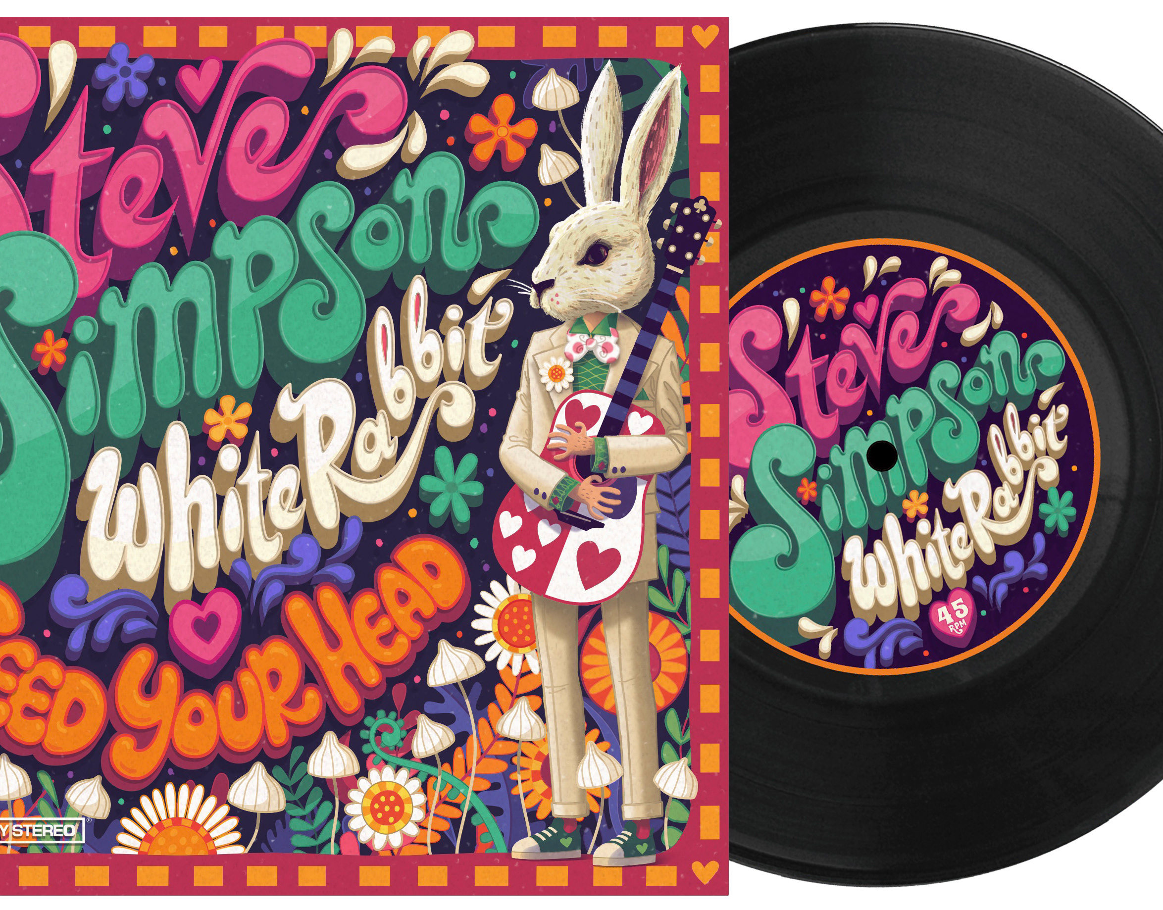 Psychedelic record cover and 7" label design for 'White Rabbit' created for my Domestika course; The Art of Record Covers: Illustration Meets Lettering