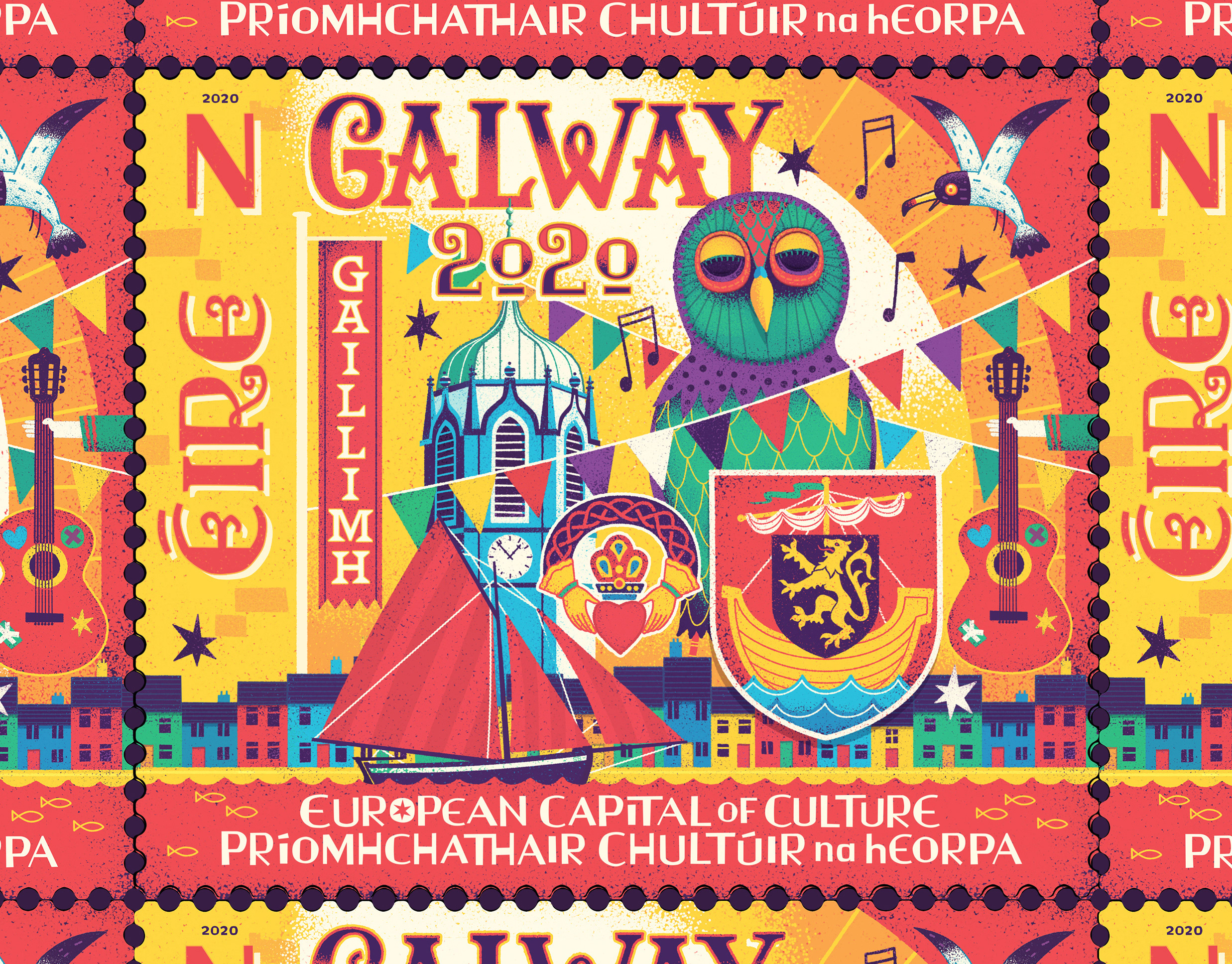 Irish postal stamp design and illustration celebrating the city of Galway as European Capital of Culture