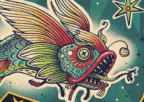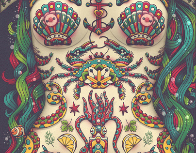 Tattooed mermaid illustration for Italian food magazine cover inspired by old school tattoos and seafood - Frutti di Mare :)))