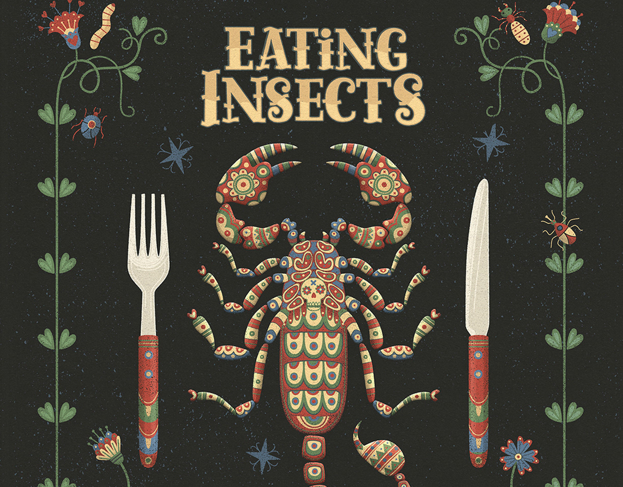 'Eating Insects' illustrated / hand lettered book cover inspired by 'folk art' and 'The Arts & Crafts Movement'. Comer Insectos